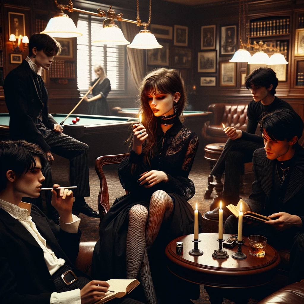 Drake, his thoughts as tumultuous as the melodies of The Cure, leaned against the ancient oak in the courtyard, his gaze lost in the dance of the fireflies. Beside him, Trish, ethereal as a muse in a painting, watched him with eyes full of unspoken words, her thoughts a blend of longing and uncertainty.